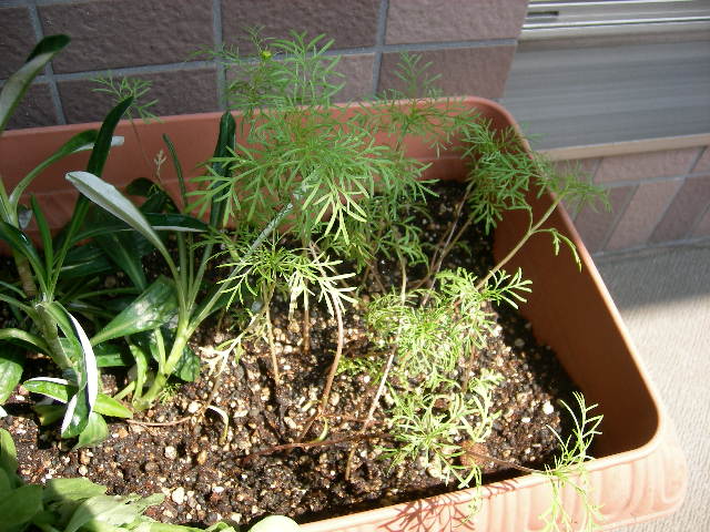 最初の鉢植えでは、密集しすぎて成長を鈍化させると聞きました。 早速、嫁さんがコスモスを広い鉢植えへ移しました。