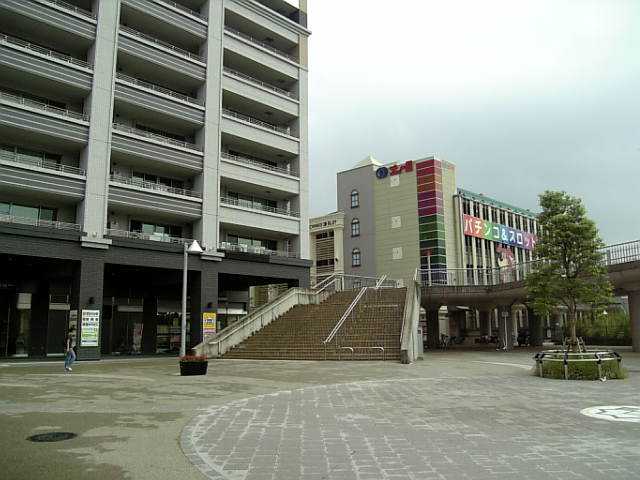 横浜国際プールへは、出た口の反対側を向きます。パチンコ屋が見えます。