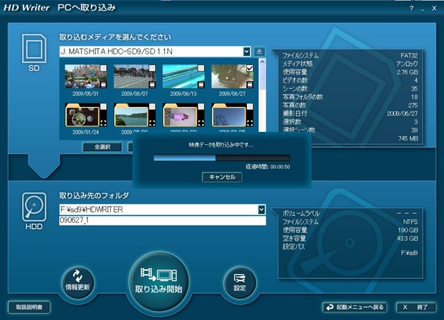 SD9からPCへ映像を取り込むには、HD WriterというSD9の付属ソフトを使います。