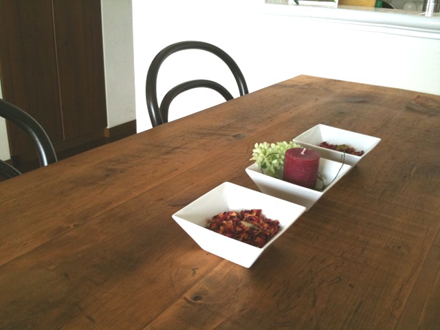 嫁が、アンティークのテーブルをポプリとキャンドルで飾ったようです。