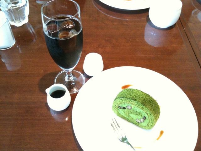 セットに付いてくるのは有機栽培の豆を使ったアイスコーヒーと、デザートは抹茶のロールケーキでした。