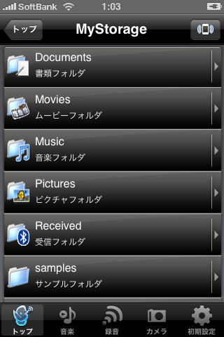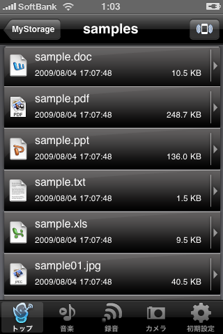 MyStorageの中には、既にsamplesというフォルダがあり、サンプルのPDFやパワポ、エクセル、ワード、テキストファイルなどが入っているので、「iPhoneで見れちゃう!」と感動できます。