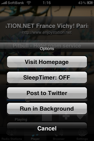 ハートマークでお気に入り登録でき、+マークをタップすると、搭載されているブラウザでホームページを見たり、Twitterに投稿したり、バックグラウンドで再生したりすることができます。