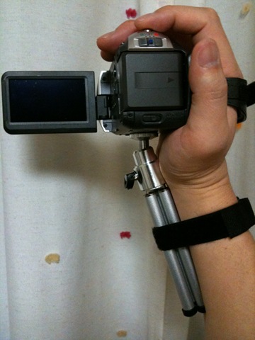 長時間撮影しても疲れないように、脇を締めた状態で撮影できるポジションに巻き付けを調整することで、手首だけで支えるよりはましな映像が撮れることが分かりました。