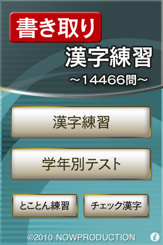 起動画面です。大きくはグレード別に分かれた全収録漢字の練習「漢字練習」と、問題数を決めてグレード別にテストできる「学年別テスト」があります。