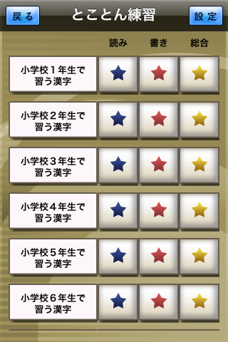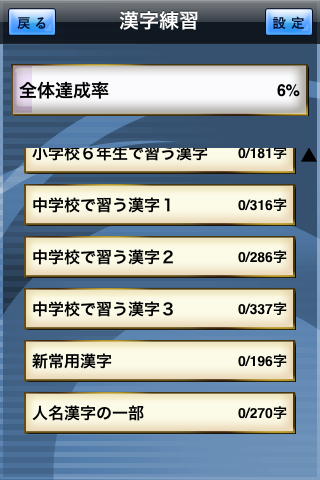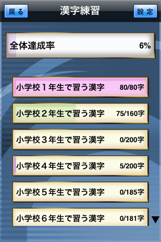 先ずは漢字練習です。一番上のバーの塗りは、全体の進捗率を表します。それぞれのグレード別のバーも同様です。