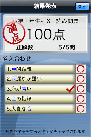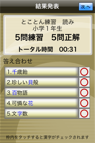 問題の回答と結果発表は、漢字練習モードと同じです。