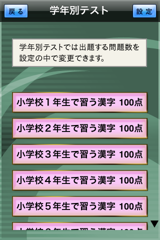 覚えたいグレードを選ぶと、5問ずつ小分けにされた読み書きの問題集が並びます。