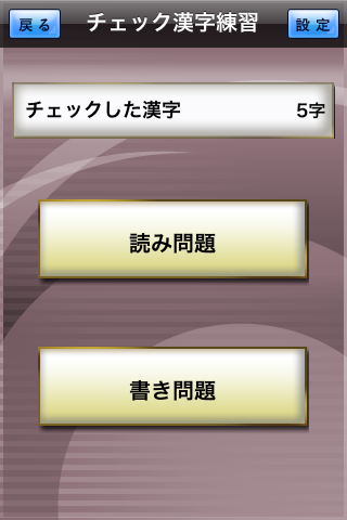 「とことん練習」は際限なく練習するモードで、チェック漢字は自分でチェックした漢字を読み書きに分けてテスト出来ます。