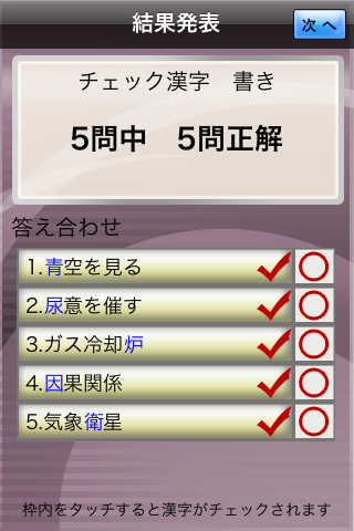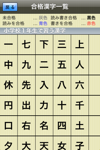 ここで覚えておきたい漢字をタップすると、漢字をチェックしたことになります。こうすることで、前述のトップ画面にある「チェック漢字」に含めることが出来ます。