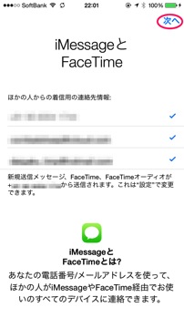 iMessageとFaceTimeに関することですね。デフォルトのまま、先へ進みました。