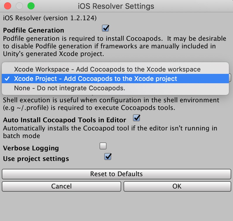ところが、Unity2019.2ではこのxcworkspaceファイル(白いアイコン)の生成でコケてるようなので、「Xcode Project – Add Cocoapods to the Xcode project 」を選択し、Xcodeプロジェクトのファイル(青いアイコン)に収まるようにしました。