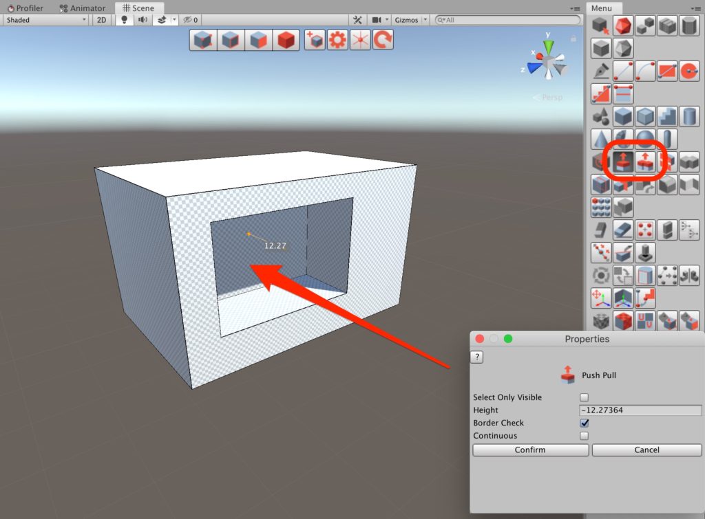 引き出す方は、よくあるExtrude機能にも似ているので「へぇ〜」くらいにしか思わないのですが、押し込む方を初めて見た時は「えぇ〜!?」ってなりました。w
