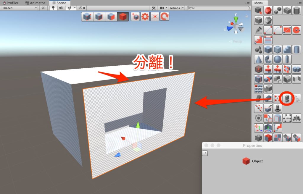 上のtwitterの動画の右下にpropertiesというフローティングパレットがおいてあるのですが、UModelerはUnityのcomponentだけでなく、このパレットからもプロパティの設定ができるので便利です。