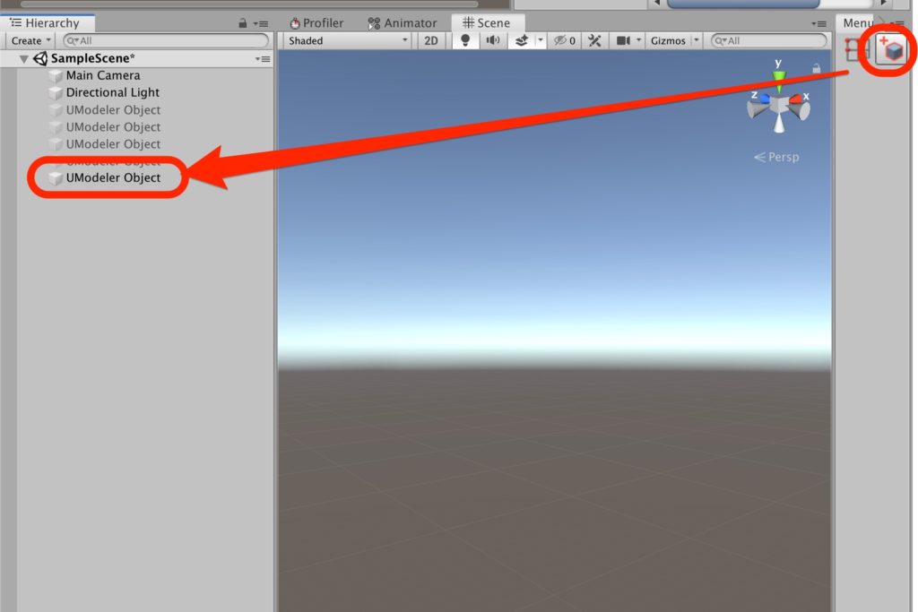UnityのHierarchyにUModeler ObjectというGameObjectを作ります。(Unity標準のCubeなどと同じ単位)