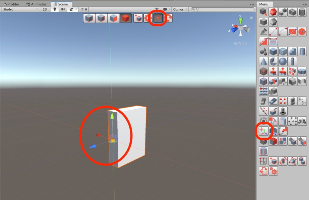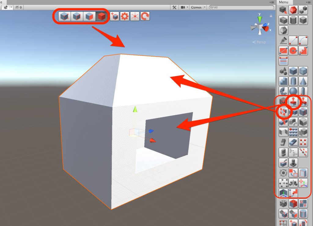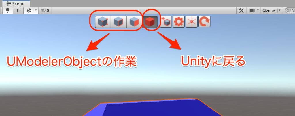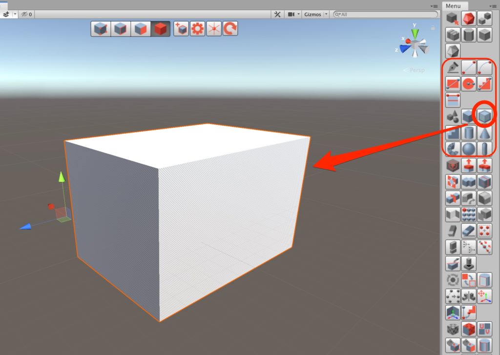 面ボタンの右隣にあるオレンジの立方体ボタンがオブジェクト単位の編集になり、UnityのGameObjectを編集することになります。