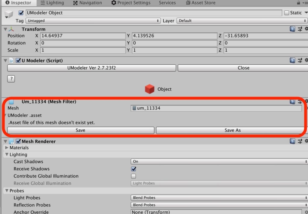 UModeler Objectで作ったメッシュをUnityの.assetファイルとして保存します。これはUnityのシーン保存とは別の保存になります。