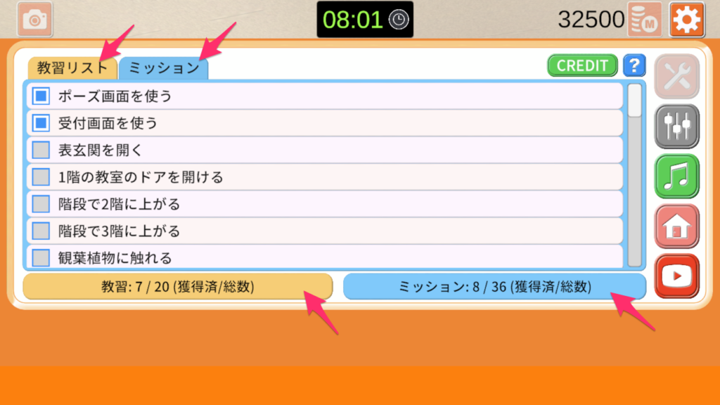 この画面で、ミッションと書かれた青いタブまたは下の数が表示されたボタンを押すと、ミッションのクリア状況を確認できるリストが表示されます。このリストを見れば、どんなミッションがあるのか分かります。