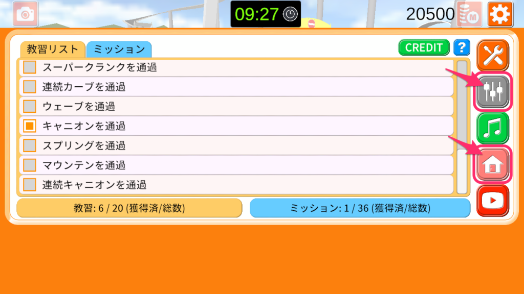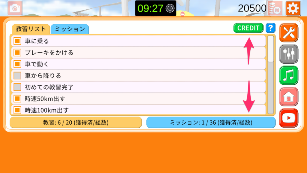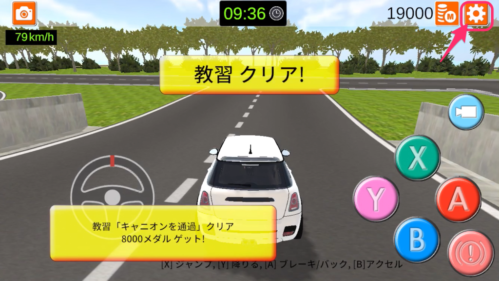 では、画面右上のポーズボタン(歯車のアイコン)を押して、クリアした教習を確認してみましょう。