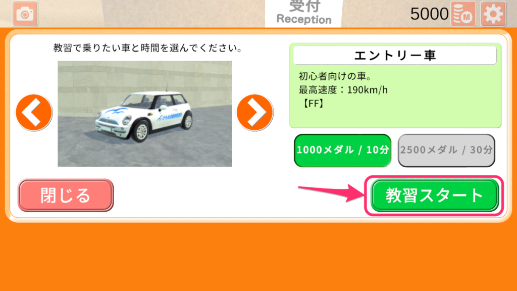 最初に初心者用のエントリー車が表示されているので、緑色の「教習スタート」ボタンを押して教習を開始してください。