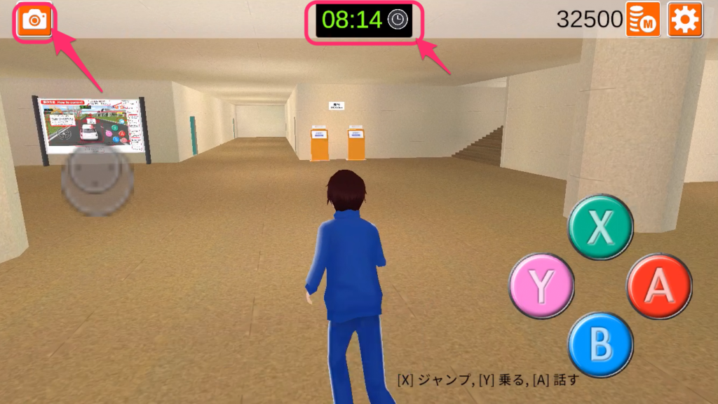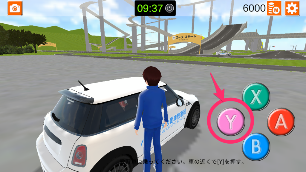 画面右側の向き回転エリアでキャラクターの向きを変えて、車を見つけてください。画面左側の移動エリアでキャラクターを車の近くまで移動させたら、画面右に4つあるボタンの内、ピンク色のYボタンを押してください。