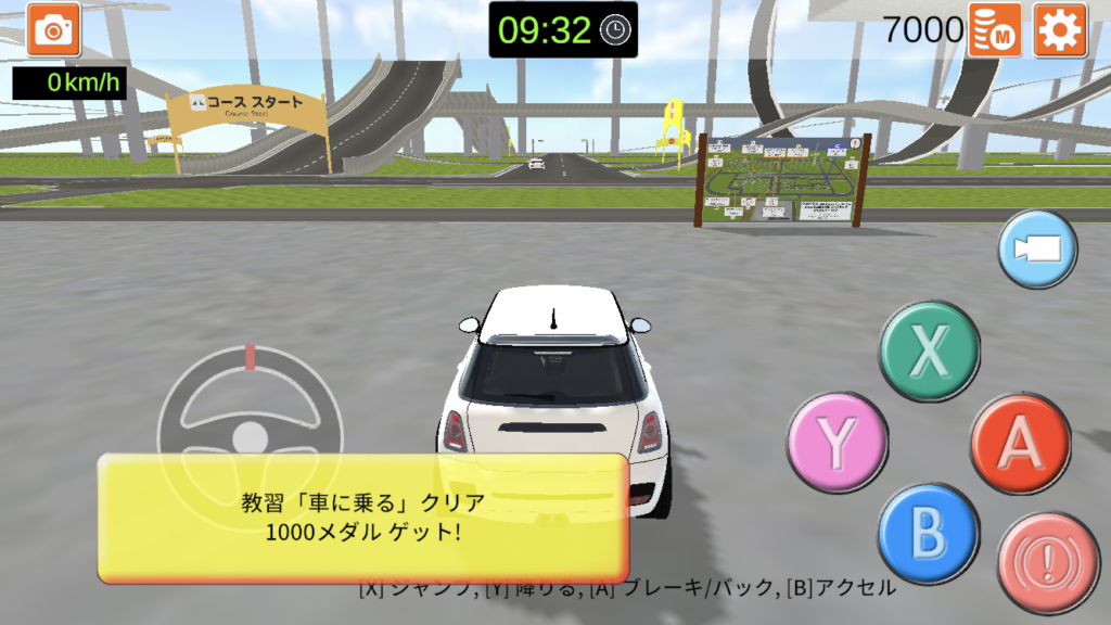最初の教習として「車に乗る」をクリアしたことが表示されます。このようにして、教習とミッションをクリアしていくと、報酬としてメダルを受け取ることができます。