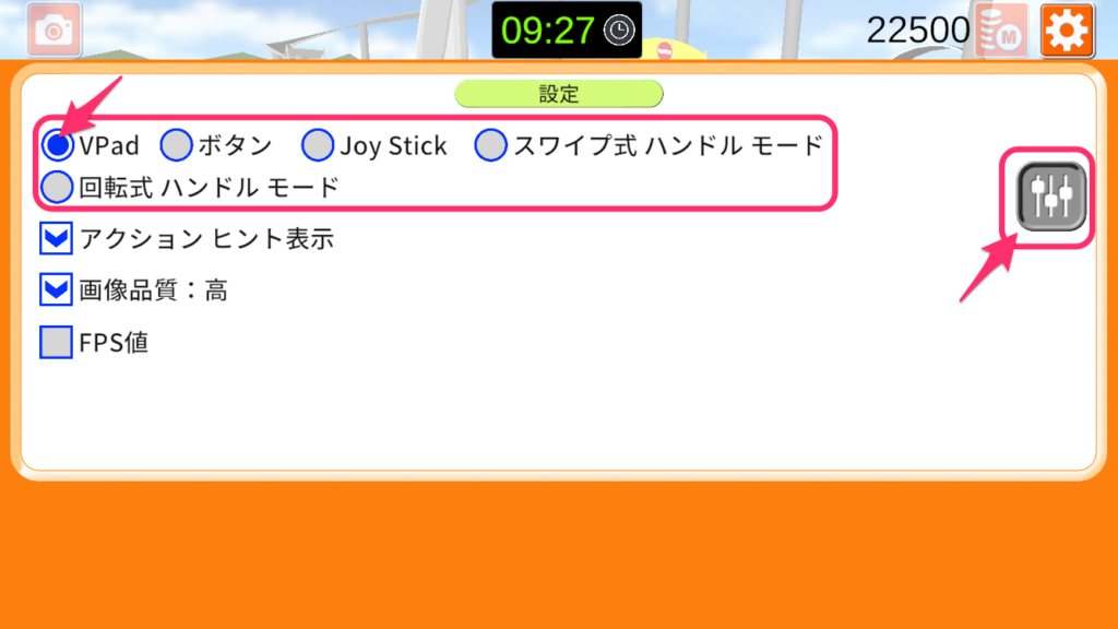 画面右上にポーズボタン(歯車のアイコン)があります。これは、ゲームをポーズしたり設定などをする時に使います。