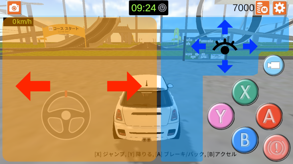 画面の左側(赤い矢印の領域)が移動操作エリアです。ここで左右にスワイプすると、車のハンドルを左右に回転させて車の進行方向を変えることができます。ハンドルを回すようにする必要はありません。左右にスワイプするだけでOKです。