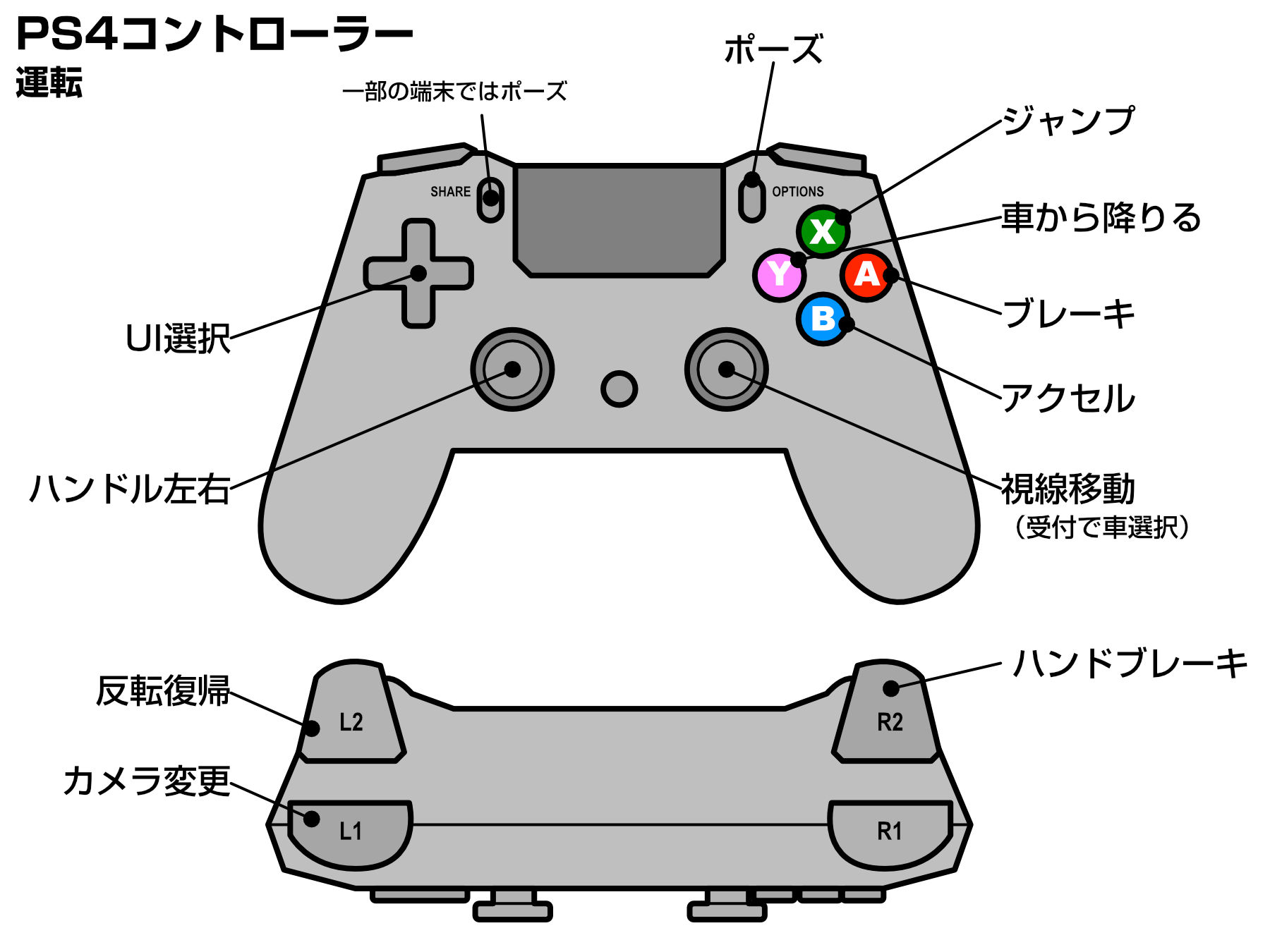 !ボタンは、サイドブレーキです。車を急停車させたり、タイヤをロックしてドリフトをするのに使います。